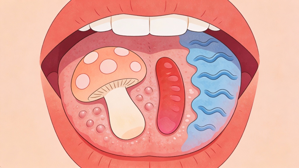• Infeksi jamur di mulut (seperti sariawan jamur/oral thrush) yang biasanya menimbulkan bercak putih yang agak tebal dan bisa terasa perih.