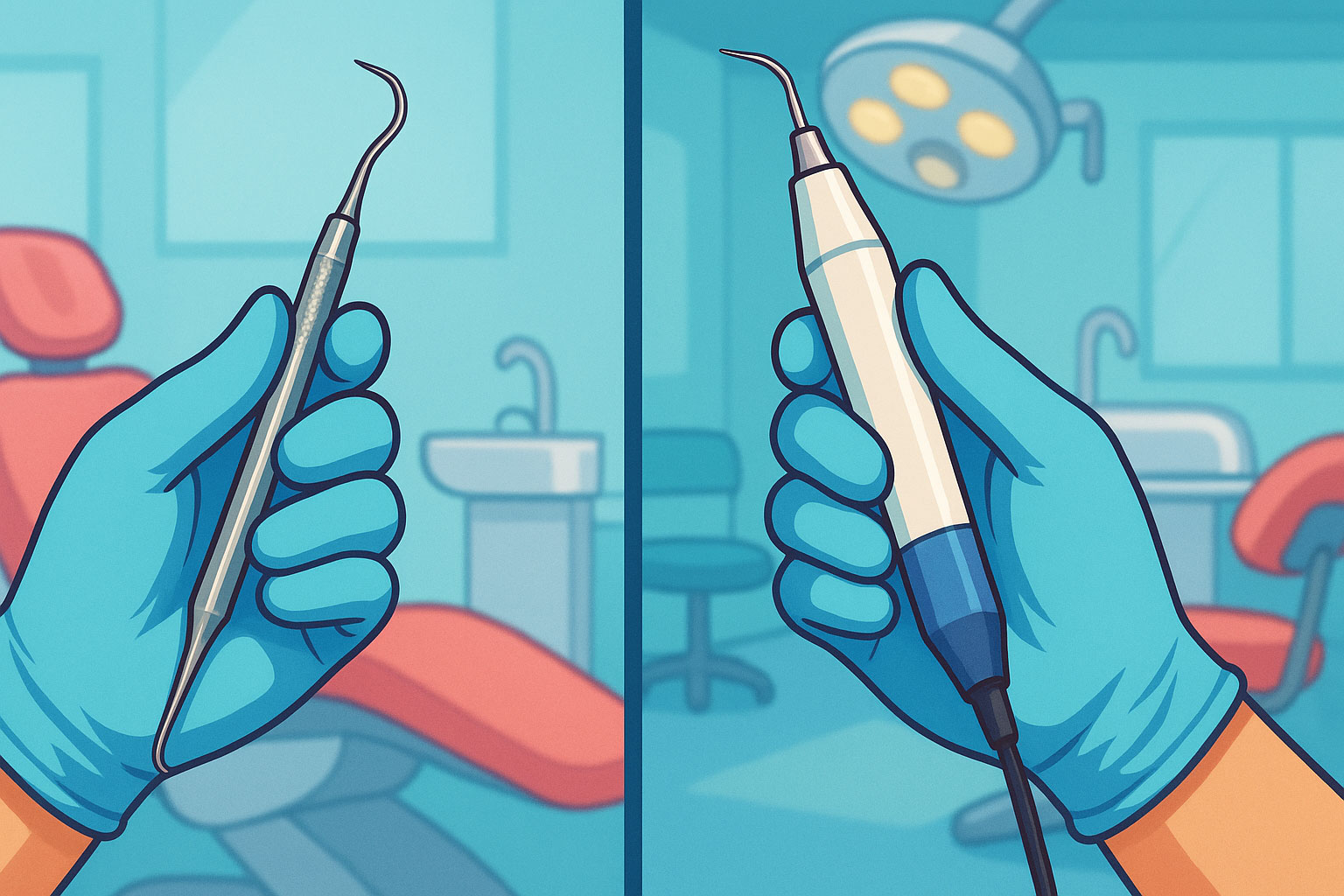 Kamu sudah tahu bahwa scaling gigi atau membersihkan karang gigi secara rutin itu wajib hukumnya. Tapi saat duduk di kursi dokter gigi, kamu mungkin pernah melihat dua jenis alat yang berbeda: satu yang terlihat seperti pengait kecil yang digunakan dengan tangan, dan satu lagi alat bermesin yang mengeluarkan getaran dan semprotan air. Kamu pun jadi bertanya-tanya, mana yang lebih bagus? Apakah bersihkan karang gigi manual yang tradisional, atau scaling ultrasonic yang modern?
