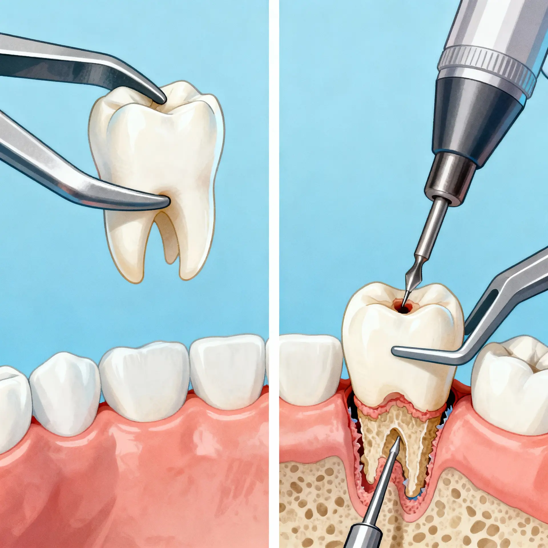 Pengangkatan tulang & pemisahan gigi: Jika diperlukan, sebagian kecil tulang yang mengelilingi gigi dibor agar area pencabutan terbuka. Untuk kasus gigi bengkok, akar bercabang, atau gigi terbenam, dokter memisahkan gigi atau akar sebelum mengangkatnya satu per satu.