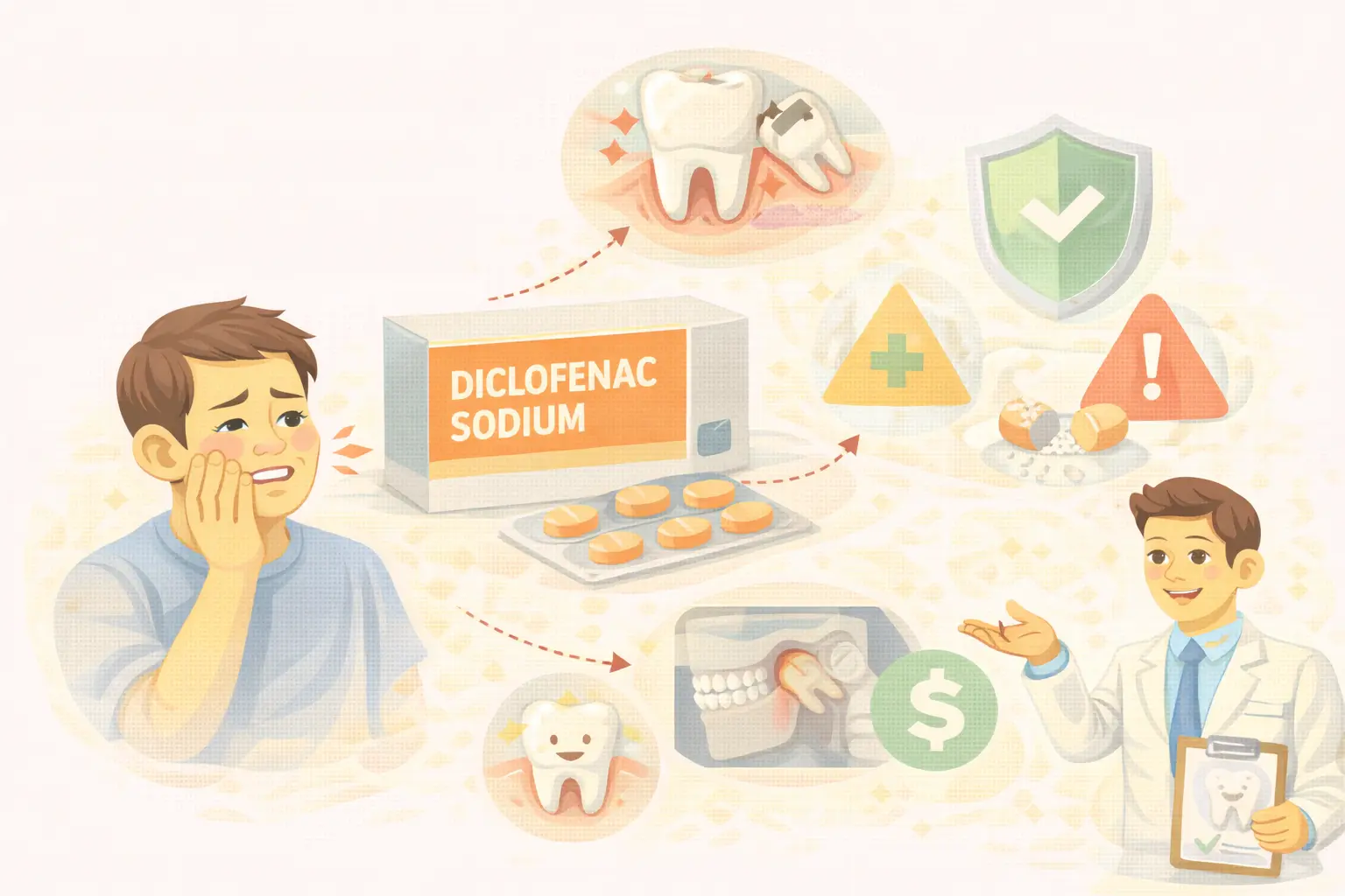 Dalam konteks gigi dan mulut, diclofenac sodium dapat membantu meredakan nyeri gigi berdenyut, nyeri setelah cabut gigi, atau nyeri gusi bengkak yang sudah mulai ditangani dengan perawatan di klinik. Namun, perannya tetap sebagai pereda gejala, bukan perbaikan sumber kerusakan gigi.