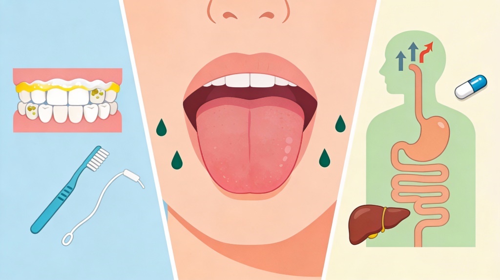 Infeksi jamur di mulut, kondisi mulut kering, dan kebersihan mulut yang kurang terjaga sangat berperan dalam munculnya rasa pahit di lidah. Tiga faktor ini saling berkaitan dan sering muncul bersamaan, sehingga keluhan tidak hanya berupa rasa pahit, tetapi juga bau mulut dan ketidaknyamanan saat makan.