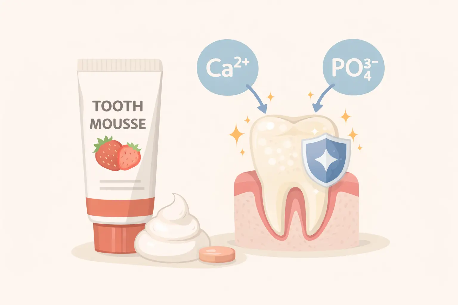 Bahan aktif khas dalam tooth mousse adalah CPP-ACP, singkatan dari casein phosphopeptide-amorphous calcium phosphate. Ini adalah kompleks mineral berbasis protein susu yang membawa kalsium dan fosfat dalam bentuk yang mudah tersedia untuk enamel. Kompleks ini dapat menempel pada pelikel saliva, plak, dan permukaan gigi sehingga mineral tetap berada dekat enamel.