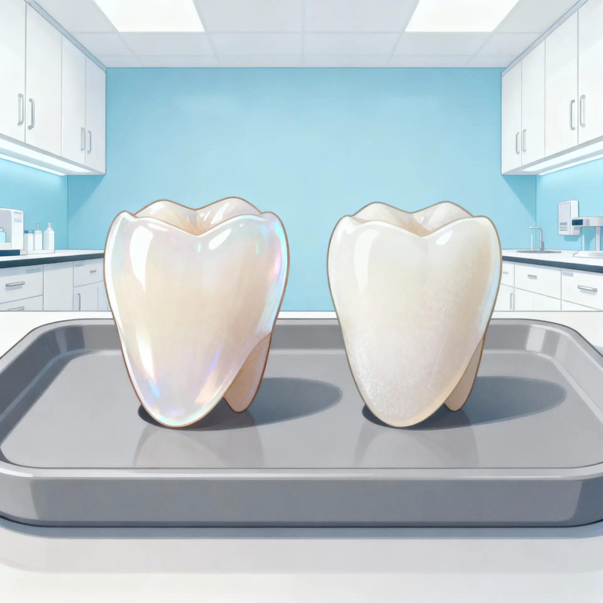 Sementara itu, veneer porselen dibuat dari keramik khusus melalui proses laboratorium, sehingga pemasangannya membutuhkan dua hingga tiga kali kunjungan. Veneer porselen dikenal sangat tahan lama dan sulit berubah warna. Ia memberikan hasil paling estetis dan natural hingga 10–15 tahun atau lebih.